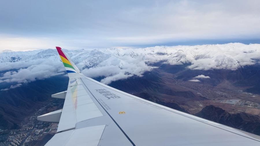西藏航空的飛機(jī)在貢嘎機(jī)場(chǎng)上空飛翔