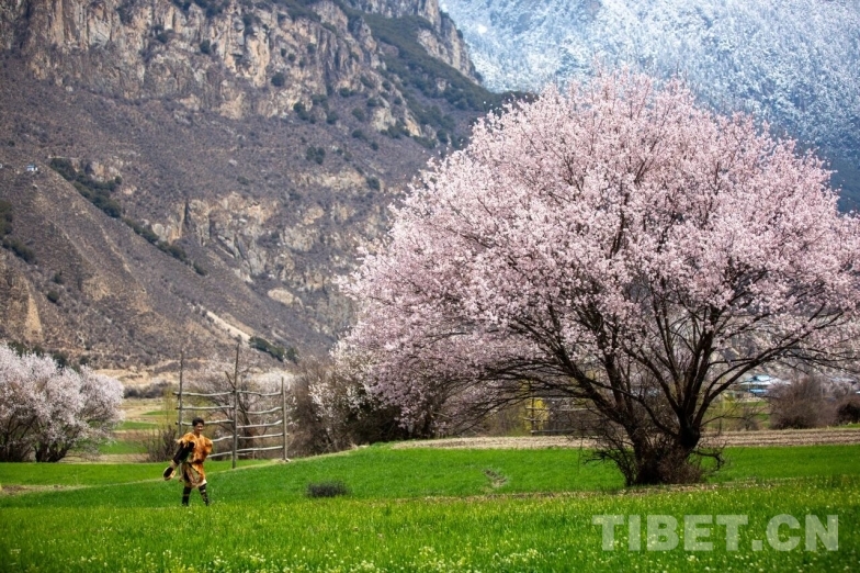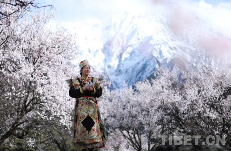 身著嘉黎特色服飾的姑娘,手捧桃枝,在雪山花海的映襯下,喜迎遠(yuǎn)方來客。