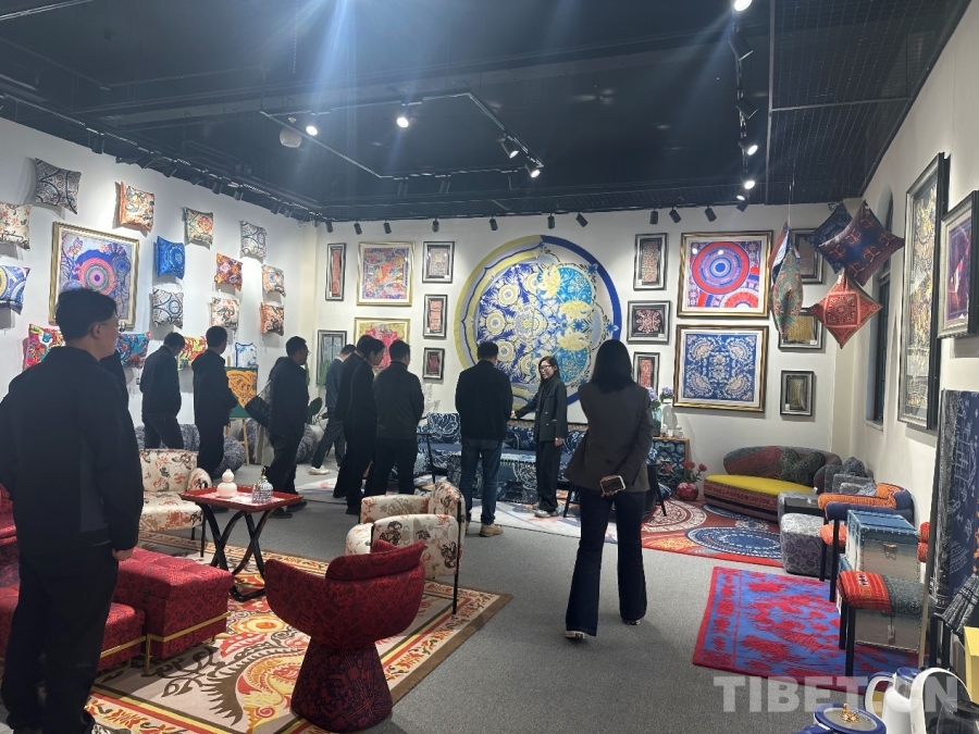依文集團工作人員向色尼區(qū)考察團介紹旗下手工作品