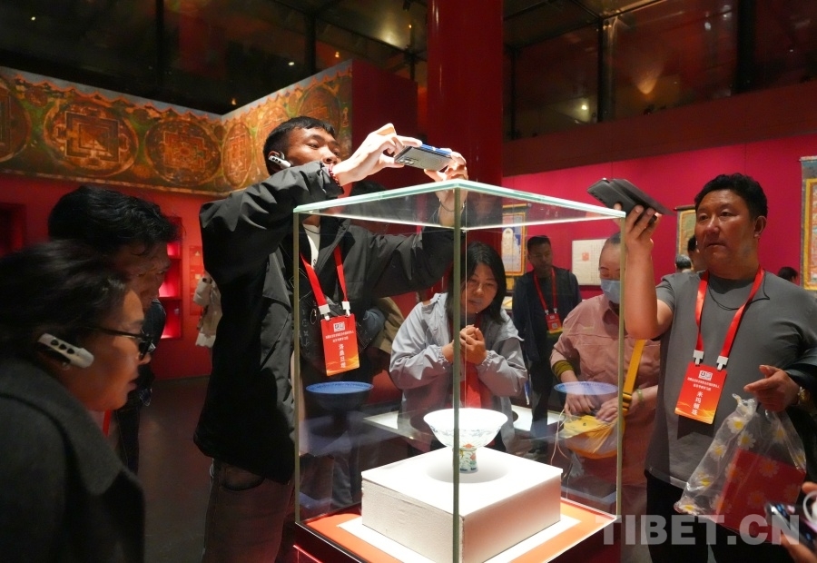 來(lái)自西藏各地的農(nóng)牧民合作組織帶頭人拍攝展品明宣德青花五彩滿(mǎn)池嬌圖靶碗。