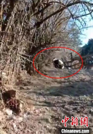 王康忠聞?dòng)嵑?,急忙趕去現(xiàn)場(chǎng),用手機(jī)拍下了短暫的視頻。視頻顯示,這只野生大熊貓正飛快地向山上跑去。