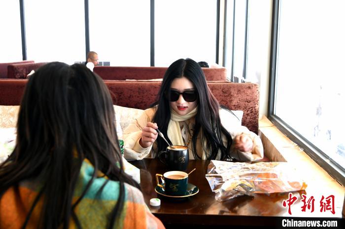 游客在品咖啡。安源 攝
