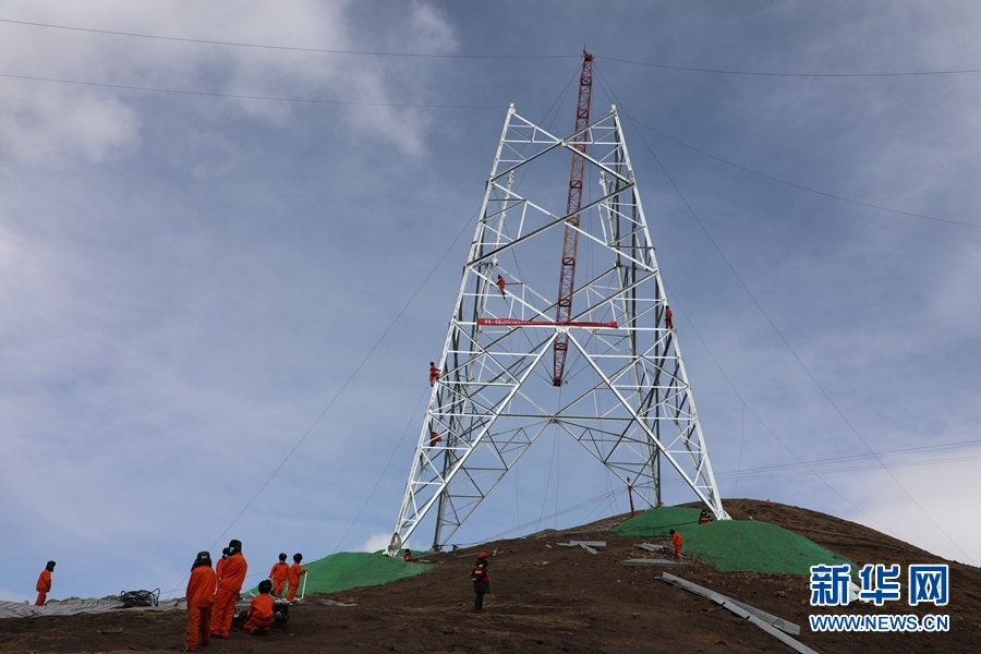 青海-河南±800千伏特高壓工程青2標(biāo)復(fù)工現(xiàn)場,施工人員進(jìn)行組塔作業(yè)。新華網(wǎng) 鄒建華 攝