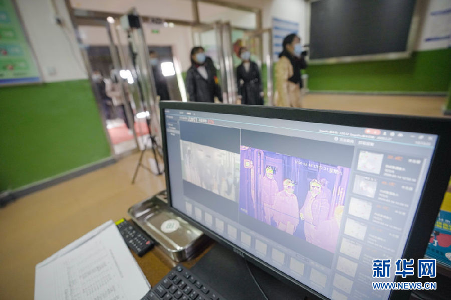 3月14日,在海北州第一高級中學(xué)教學(xué)樓入口處,學(xué)生在依次通過體溫監(jiān)控儀。新華社 吳剛 攝