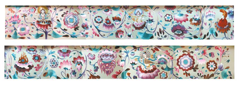 楊華珍的很多作品,是在傳統(tǒng)的基礎(chǔ)上再度創(chuàng)作。大牌頻頻青睞的《十二月花》,緣自她對(duì)羌族文化的打撈。“羌族文化中,有一種說法是每一個(gè)月份有一朵不同的花代表,比如2月是櫻花,3月是桃花?!睏钊A珍把12種花朵繡在一幅作品上?!段迨浠ā防?,她讓56朵花長(zhǎng)在同一根藤蔓上,既是“56個(gè)民族、56支花”的生動(dòng)演繹,更有“56個(gè)民族同氣連枝”的寓意。花朵是團(tuán)花,象征和睦團(tuán)圓。而《蓮花化生圖》,靈感則來自于敦煌壁畫。在敦煌石窟里,楊華珍無意間看到了石窟頂部的蓮花和飛天,“蓮花在藏傳佛教中有修成正果的美好寓意”,她查閱了相關(guān)文獻(xiàn)和資料照片,再到唐卡中找尋內(nèi)容和故事填充。