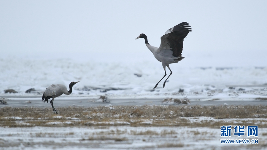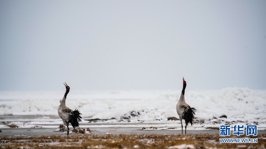4月17日,受冷空氣影響,青海省海北藏族自治州剛察縣迎來(lái)一場(chǎng)春雪,兩只雪域“精靈”黑頸鶴在青海湖仙女灣景區(qū)“與雪共舞”,上演青海湖畔最美“雪中情”。