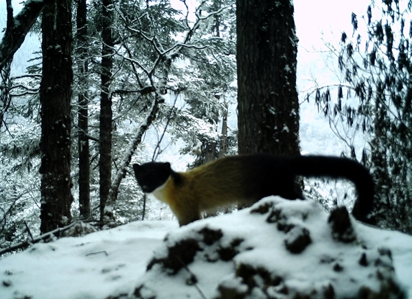 此次拍攝到的視頻資料顯示,在保護(hù)區(qū)多個(gè)點(diǎn)位都有大熊貓活動(dòng)的身影,并且出現(xiàn)了多次,其中在同一區(qū)域,兩次拍到大熊貓嗅味樹(shù)標(biāo)記行為;在同一點(diǎn)位同時(shí)拍攝到大熊貓、川金絲猴、金貓、黃喉貂、黑熊、毛冠鹿、野豬、豪豬等8種動(dòng)物活動(dòng)影像。此外,保護(hù)區(qū)還首次拍攝到金貓活動(dòng)影像。