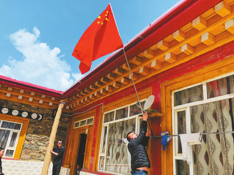 近日,阿壩州壤塘縣群眾在家門口插上國旗。壤塘縣委宣傳部供圖