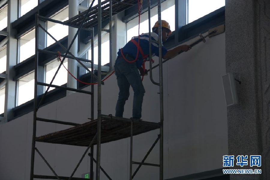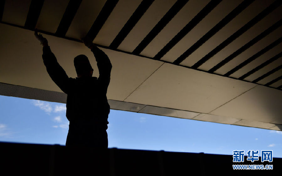 6月28日,在新建的青海省海西蒙古族藏族自治州格爾木火車站,工人在檢查站臺(tái)天花板。新華社記者 張龍 攝
