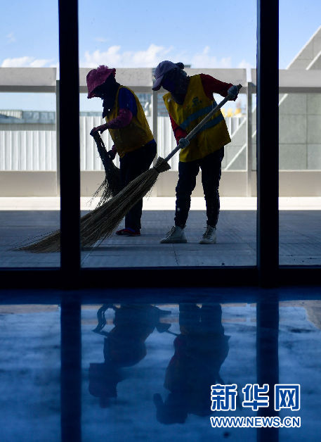 6月28日,在新建的青海省海西蒙古族藏族自治州格爾木火車站,工作人員在清潔車站內(nèi)壁。新華社記者 王浡 攝