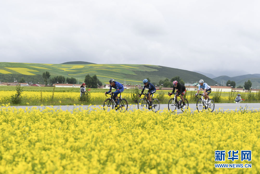 2019年7月21日,車手們在比賽中騎行。當日,第十八屆環(huán)青海湖國際公路自行車賽展開第八賽段——西海鎮(zhèn)到青石嘴的角逐。新華社 張龍 攝