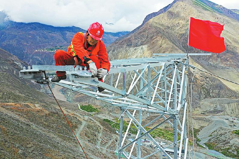 5月24日,甘孜州巴塘縣中咱-蘇洼龍35千伏線路工程78號塔放線現(xiàn)場,施工人員正在塔上進行放線作業(yè)。