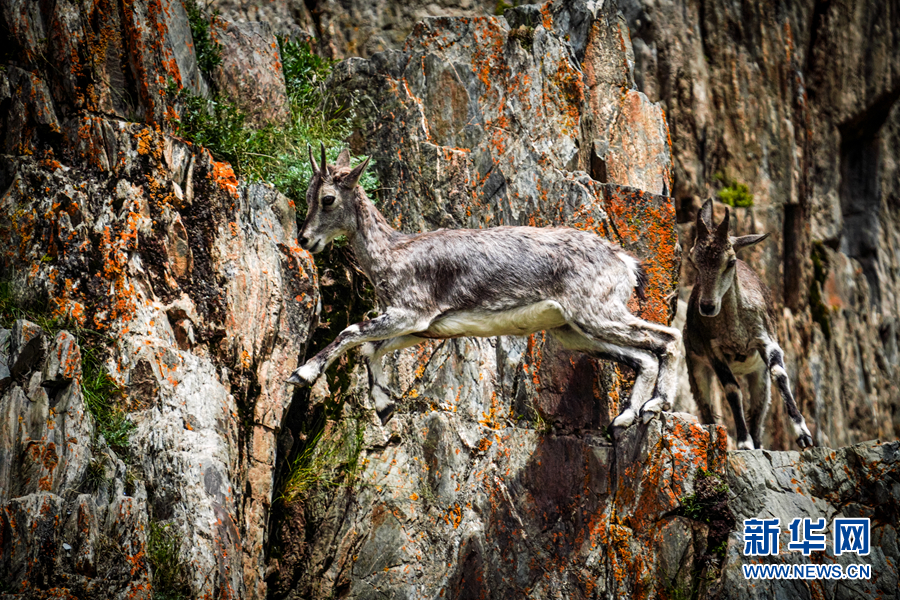 兩只巖羊在巖壁上跳躍。新華網 宋忠勇 攝