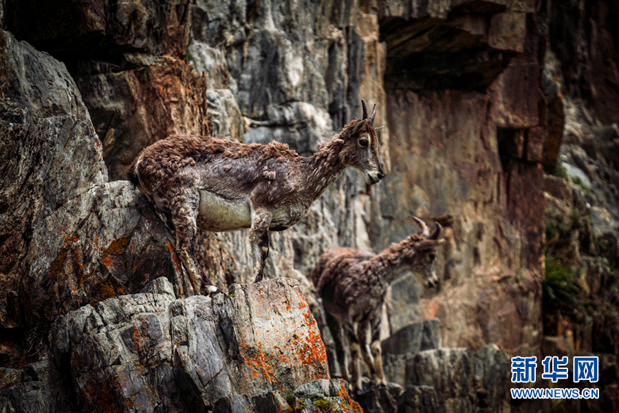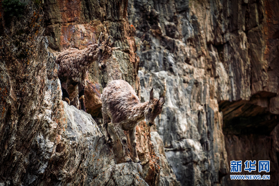 兩只巖羊在巖壁上行走。新華網 宋忠勇 攝