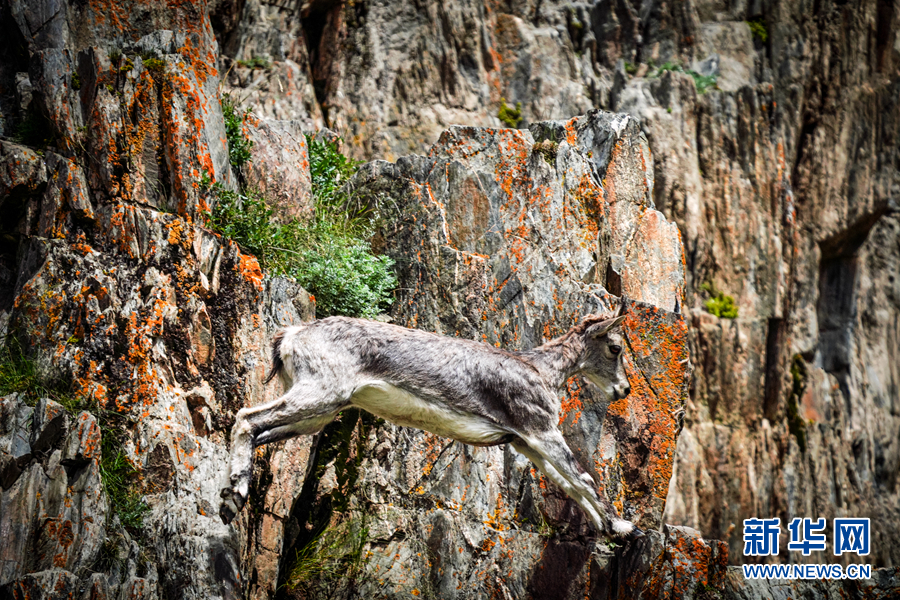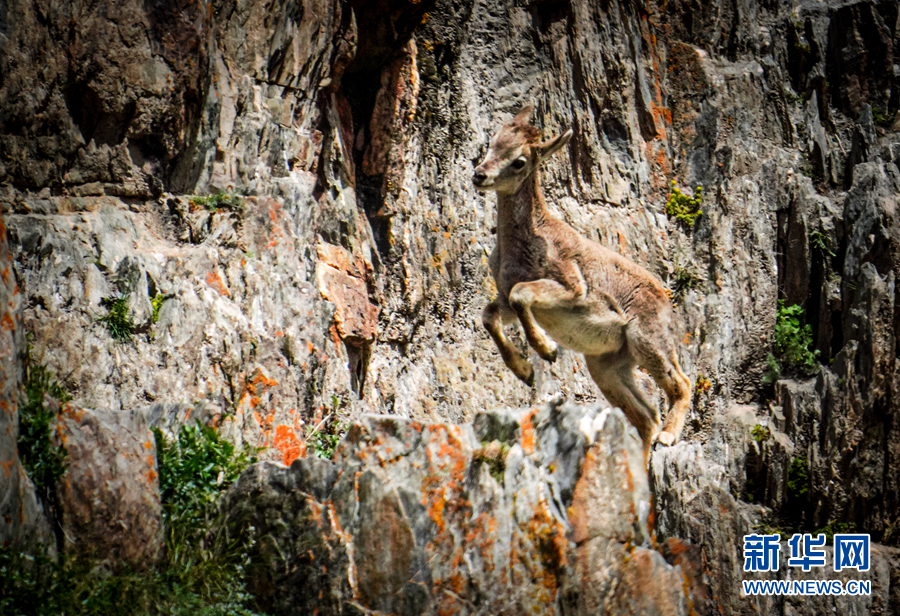 一只巖羊在巖壁上跳躍。新華網 宋忠勇 攝
