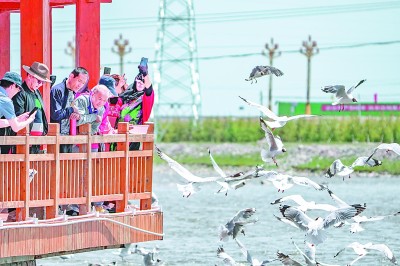 在青海省海北藏族自治州剛察縣的沙柳河湟魚家園,水鳥翔集,引來眾多游人駐足。徐譚 攝