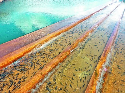 記者在沙柳河、泉吉河附近發(fā)現(xiàn),成群的湟魚聚集在敞開式過魚通道前,有的已經(jīng)率先拾階而跳,向產(chǎn)卵區(qū)進(jìn)發(fā)。此外,還有不少在增殖放流站內(nèi)等待放流的湟魚,它們均由人工在河里采集魚卵并培育而來。