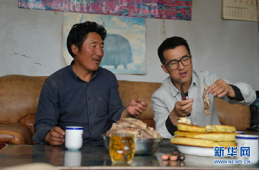 8月13日,尤拉太(左)和父親尕藏本在自家的羊圈內(nèi)交談。新華社記者 張宏祥 攝
