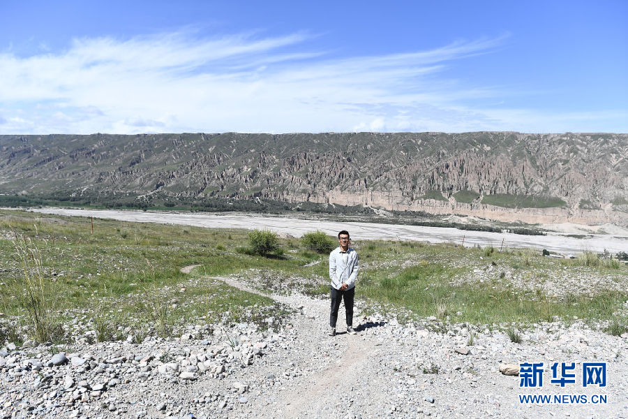 8月13日,尤拉太在夏塘村留影,他身后的山路是他上小學(xué)時(shí)步行前往學(xué)校的必經(jīng)之路。新華社記者 張宏祥 攝