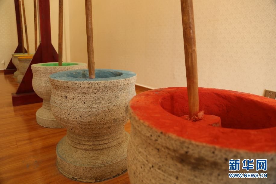 圖為顏料碾磨室。繪制唐卡的顏料由純天然的礦物制成,色彩鮮艷、歷久彌新。新華網 卡婭梅朵攝