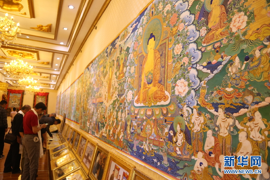 在龍樹花苑的展示大廳,游客正在觀賞展出的唐卡作品。新華網 卡婭梅朵攝