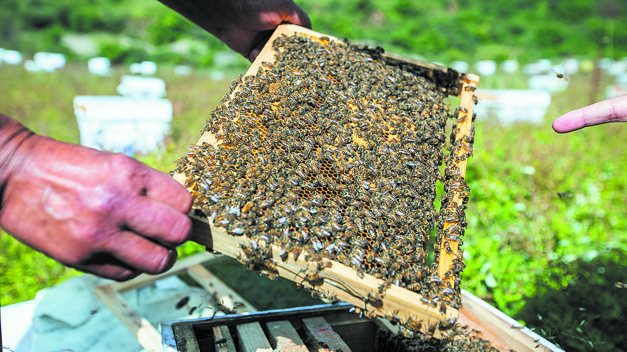 蜜蜂進場了,楊顯舉隔天就會打個電話到蜂場了解情況?!懊鄯溥m不適應,花源夠不夠?”得知第一次選址的基地連續(xù)遭遇“熊瞎子”時,他又緊急協(xié)調鄉(xiāng)上一起重新選址。遇到天氣突變,他也要打電話提醒……直到一個多月后,專家親口告訴他“今年每箱產(chǎn)量將超過30斤,而且品質非常高”時,他這才把一顆懸著的心放回了肚子里。