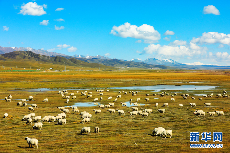 藍(lán)天白云之下,羊群悠閑自在地吃著草,與草原相映成趣。新華網(wǎng) 蘇金元 攝