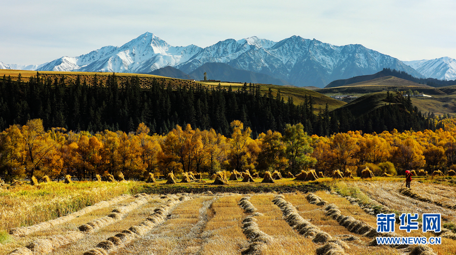 金黃色的樹(shù)木與遠(yuǎn)山交相輝映,處處呈現(xiàn)出醉人的美景。新華網(wǎng) 蘇金元 攝