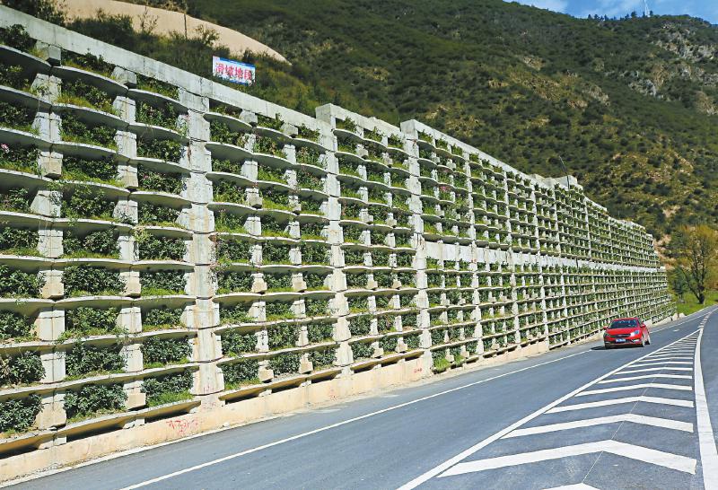 災后重建中,九寨溝縣進行地災治理,并栽花種草,進行綠化、美化,圖為公路擋墻變花墻。易西 攝