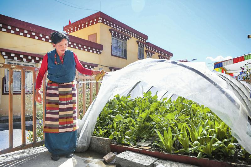 10月12日,甘孜縣吉絨隆溝集中安置點村民展示自己種植的蔬菜。四川日報 楊樹 攝