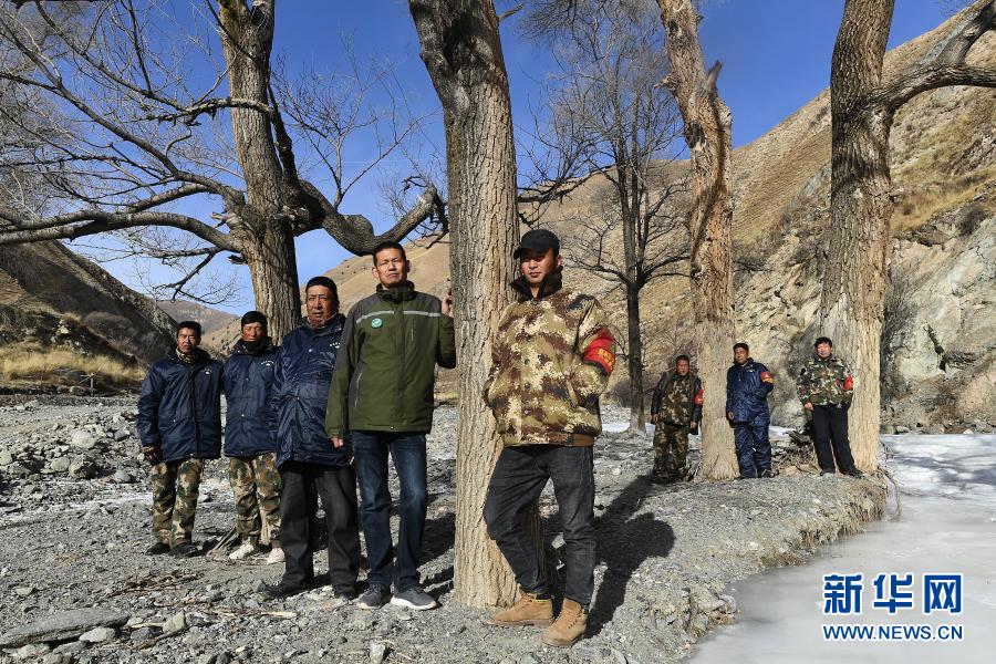 12月8日,祁連山國家公園扎麻什管護(hù)站工作人員郝生寶、昂旦才讓、索安東周、楊國林、索安拉什旦、昂毛什加、多杰昂秀、周曲才郎在巡護(hù)途中合影(從左至右)。新華社記者 張宏祥 攝