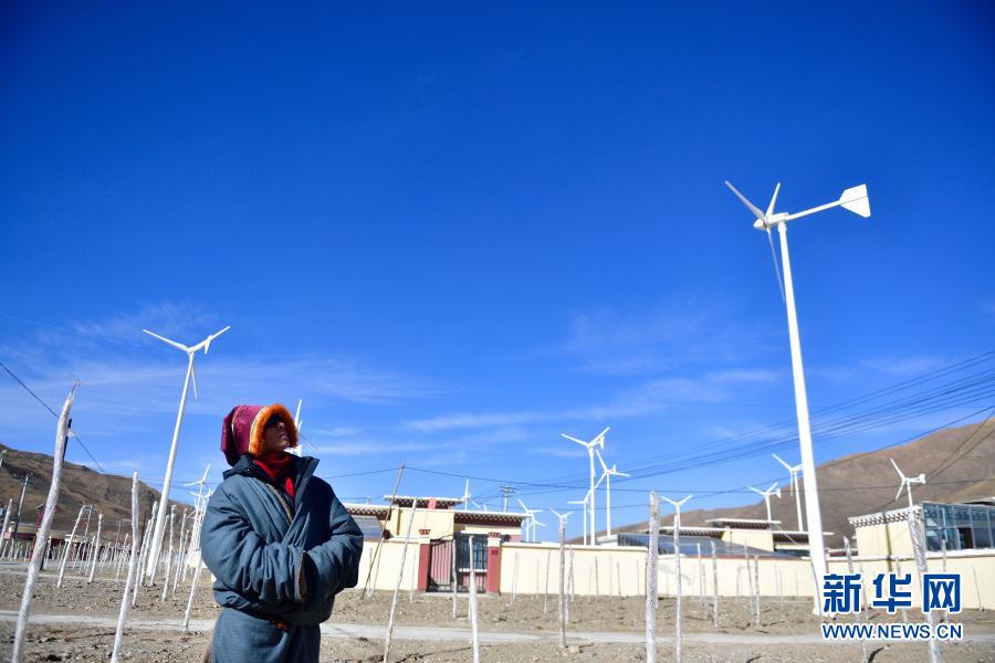 1月11日,隆亞村村支部書記貢保多杰在查看搬遷點(diǎn)的風(fēng)力發(fā)電機(jī)組運(yùn)行情況。新華社記者 張龍 攝