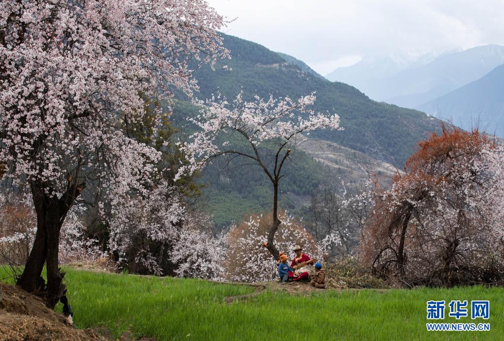 4月4日,在得榮縣徐龍鄉(xiāng)徐堆村,藏族群眾在桃花林下表演當(dāng)?shù)馗栉琛X(jué)央彈唱。新華社記者 江宏景 攝