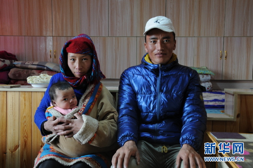 在青海省黃南藏族自治州尖扎縣尖扎灘鄉(xiāng)薩尕尼哈易地扶貧搬遷安置點(diǎn),村民李加才讓與妻子尚周瑪、女兒曲珍措在家中合影(2020年12月17日攝)。新華社記者 顧玲 攝