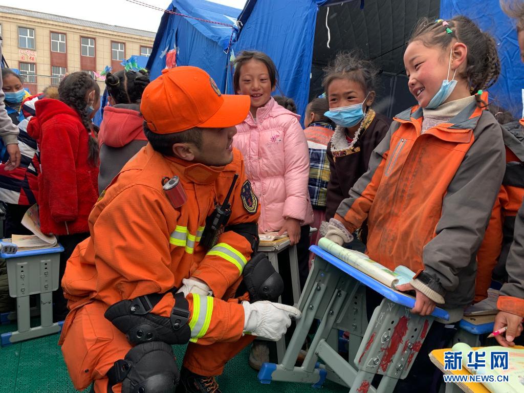 5月25日,青海省玉樹藏族自治州消防救援支隊消防員群英尕?。ㄗ螅┰诂敹嗫h民族寄宿制中學(xué)的安置區(qū)與學(xué)生交談。 新華社記者 解統(tǒng)強(qiáng) 攝