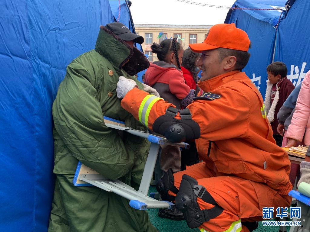 22日,地震發(fā)生后,群英尕丁來到安置區(qū)搭建帳篷和消防排查,12歲的班瑪華桑就與身穿橙色制服的群英尕丁結(jié)下了兄弟情誼?!拔覀兪且惠呑拥男值埽@幾天你也要照顧好自己。”群英尕丁笑著囑咐班瑪華桑。