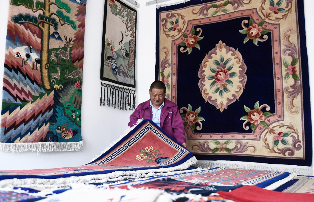 6月5日,在青海省西寧市湟中區(qū)上新莊鎮(zhèn)加牙村,楊永良在整理制作好的藏毯。新華社記者 張龍 攝