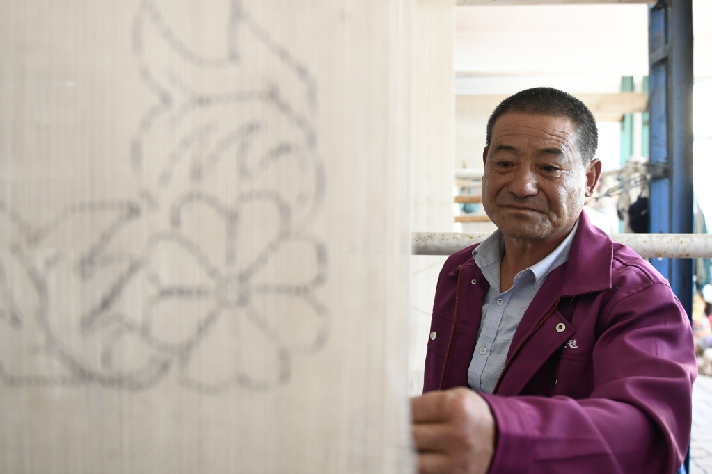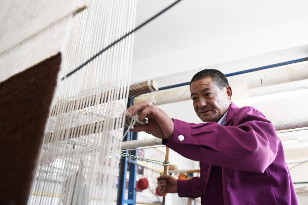 在青海省西寧市湟中區(qū)上新莊鎮(zhèn)加牙村,藏毯手工藝人楊永良坐在一臺織機前,五顏六色的毛線穿梭在編織桿間,重疊打扣后,慢慢延展成花色精美的藏毯。