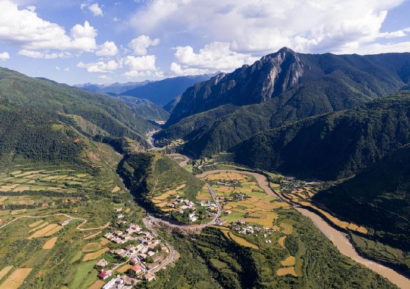 在道孚縣瓦日鄉(xiāng)瓦日村,俯瞰鮮水河谷兩岸的風(fēng)光(7月23日攝,無人機照片)。新華社記者 江宏景 攝