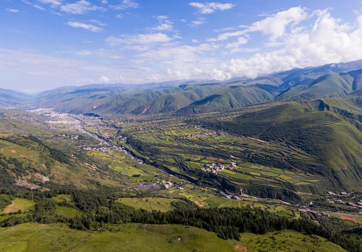 在道孚縣鮮水鎮(zhèn),俯瞰格西河谷地帶風(fēng)光(7月25日攝,無人機照片)。新華社記者 江宏景 攝