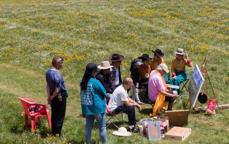 7月22日,在道孚縣玉科大草原,一名畫家在花海里創(chuàng)作油畫,吸引了當(dāng)?shù)啬撩窈陀慰蛧^。新華社記者 江宏景 攝