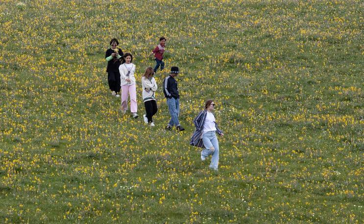 7月25日,在道孚縣龍燈草原,游客在花海中游玩。新華社記者 江宏景 攝