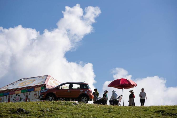 7月25日,在道孚縣鮮水鎮(zhèn),人們在草原上休閑。新華社記者 江宏景 攝