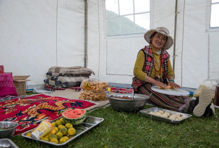 7月25日,在道孚縣龍燈草原,牧民在帳篷里做包子。新華社記者 劉夢琪 攝