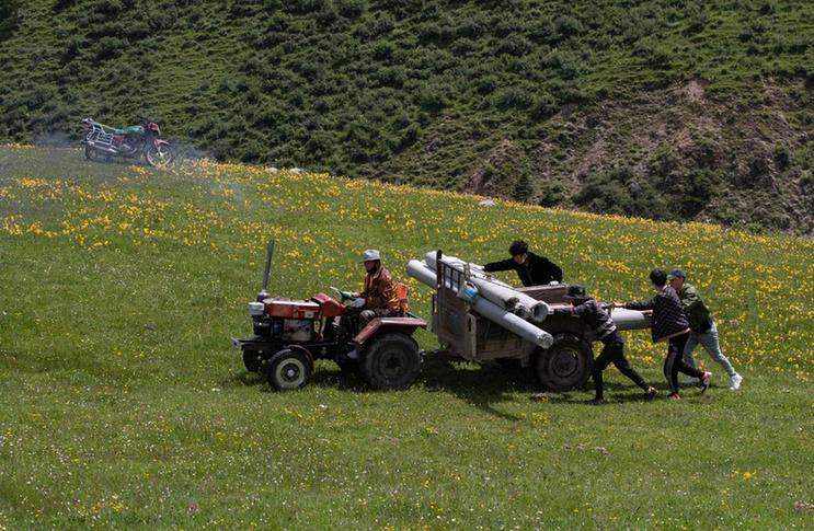 7月25日,在道孚縣龍燈草原,牧民在運輸水泥電線桿。新華社記者 劉夢琪 攝