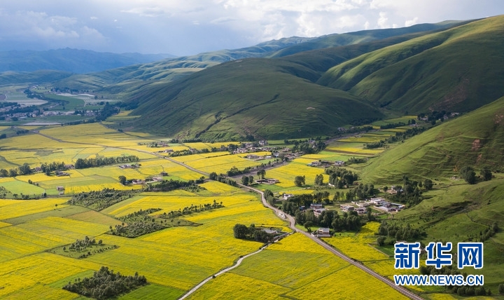 在道孚縣泰寧鎮(zhèn),民居點綴在成片的油菜花海中(7月24日攝,無人機照片)。新華社記者 江宏景 攝