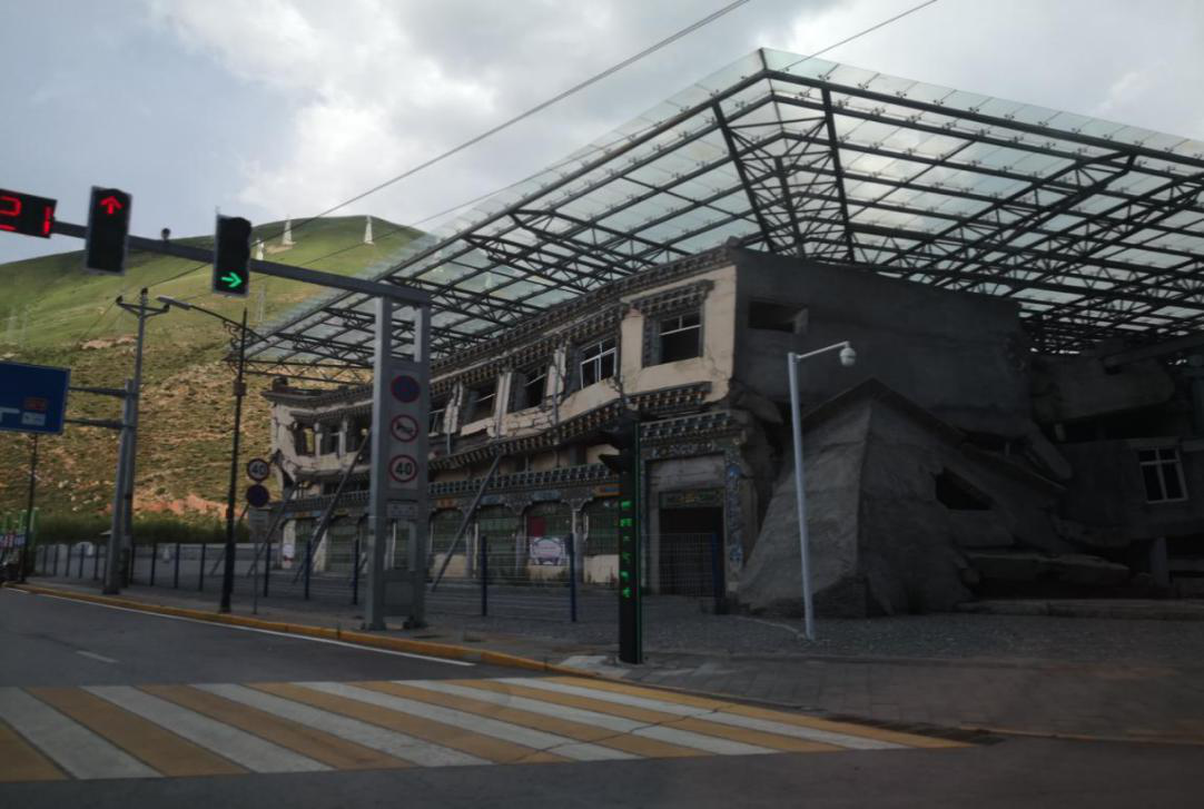 沿著214國(guó)道駛?cè)肭嗪J∮駱?shù)州玉樹(shù)市,在第一個(gè)路口闖入眼簾的是一座在地震中損毀的房子——這就是3層樓高、擁有71間客房的格薩爾王賓館,它被保留下來(lái)作為對(duì)十年前那場(chǎng)災(zāi)難的紀(jì)念。