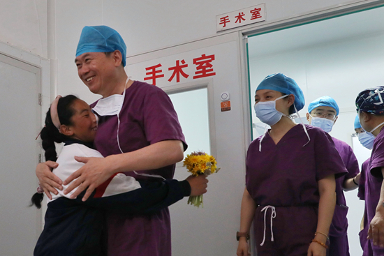 當(dāng)做完14臺(tái)手術(shù)的中國(guó)工程院院士、北京清華長(zhǎng)庚醫(yī)院院長(zhǎng)董家鴻從手術(shù)室走出來(lái),旦正措趕緊上前,與董爺爺擁抱。