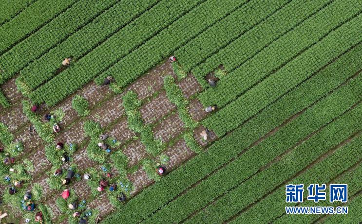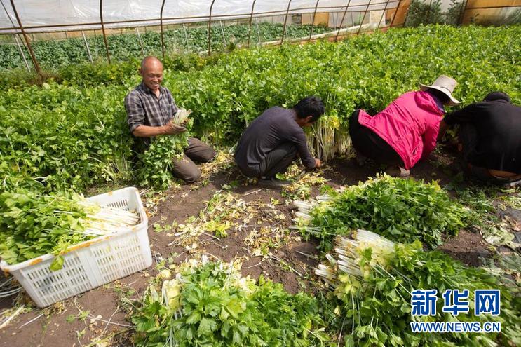 8月13日,在四川省阿壩藏族羌族自治州紅原縣邛溪鎮(zhèn)熱坤村的蔬菜大棚,種植戶在收割芹菜。新華社記者 江宏景 攝