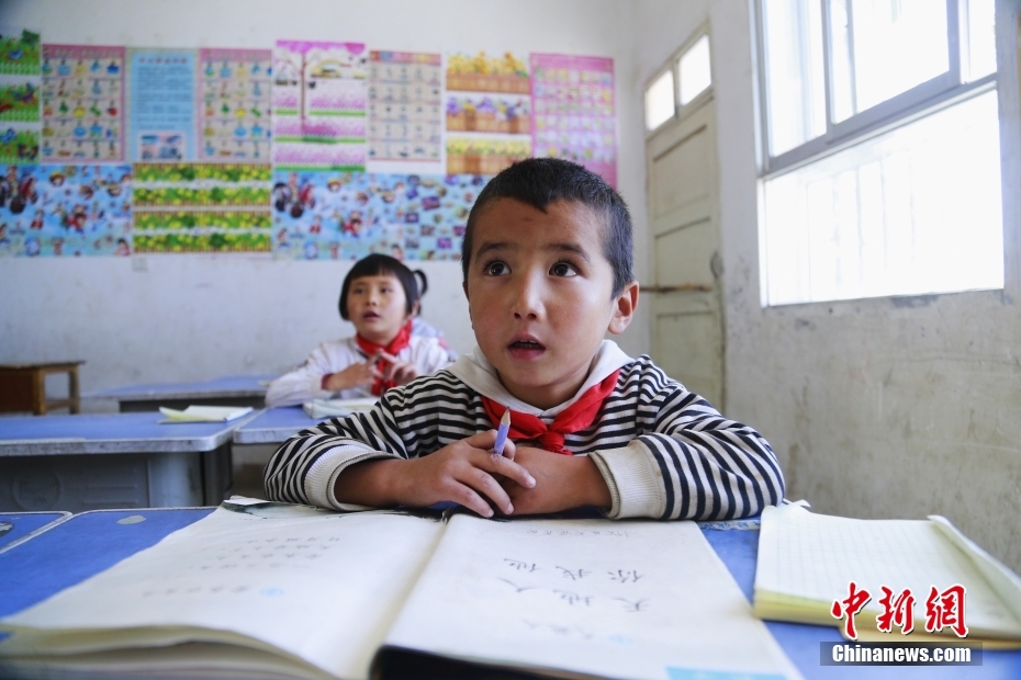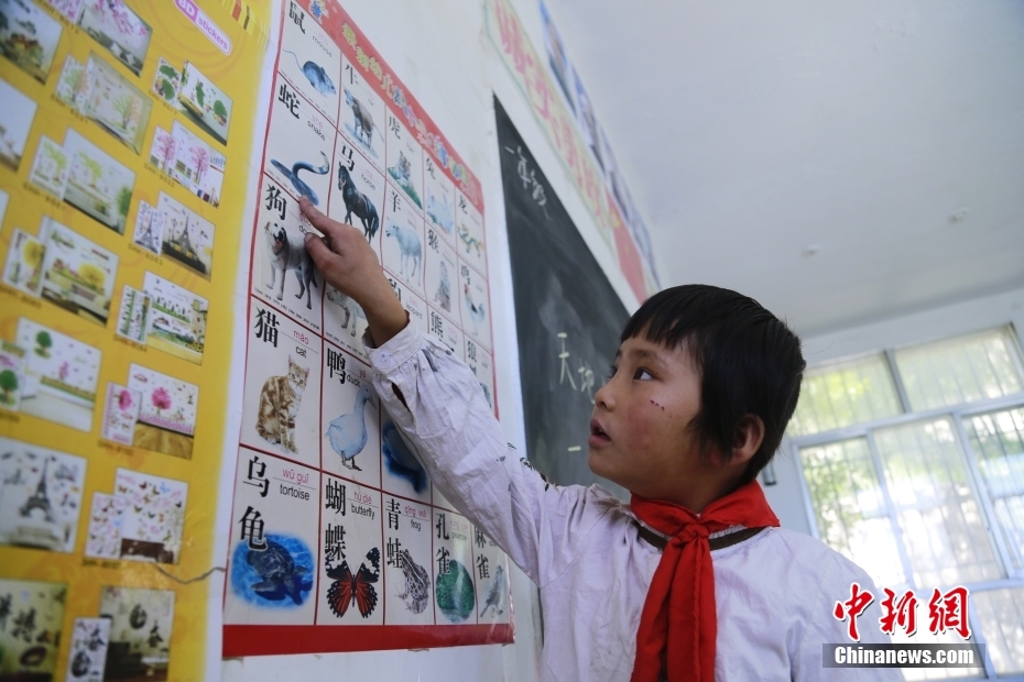 一名學生在看圖識字。中新社記者 馬銘言 攝